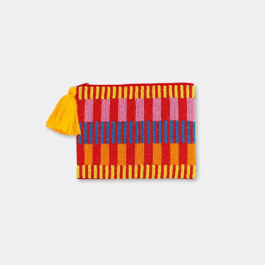 - Beaded pouch with eye-catching red, pink, orange, yellow and blue abstract stripe design