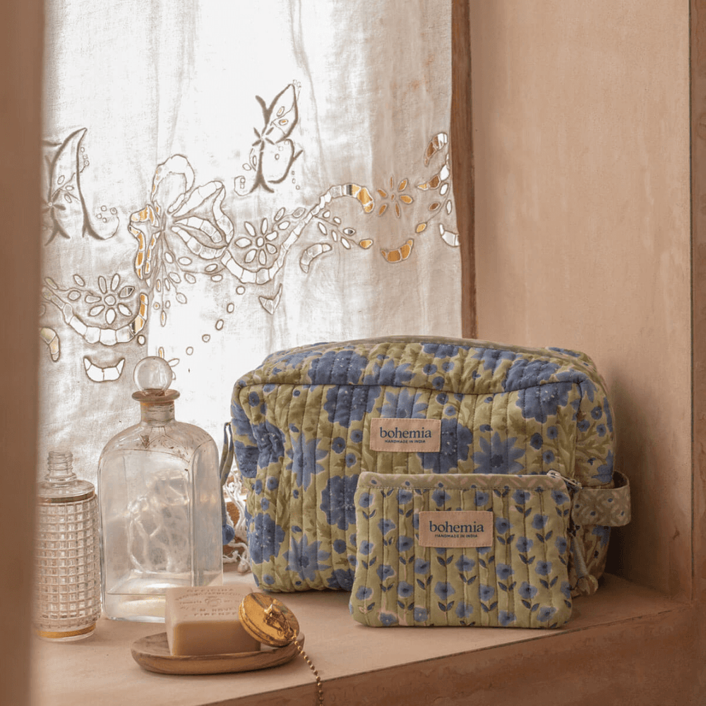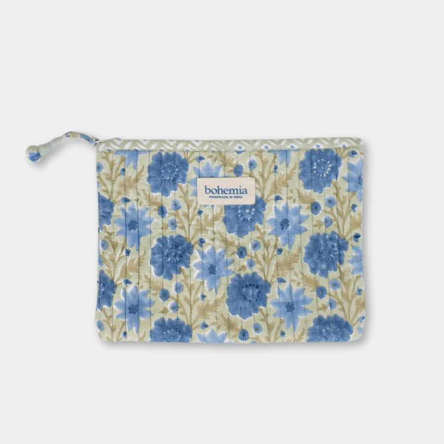 The block printed design features a sage green background and blue and green floral motif, inspired by the iconic Indian temple garlands. These gorgeous pouches are ethically made by a small, family-run business that adheres to a zero-waste policy by reusing textile scraps to create handmade papers.