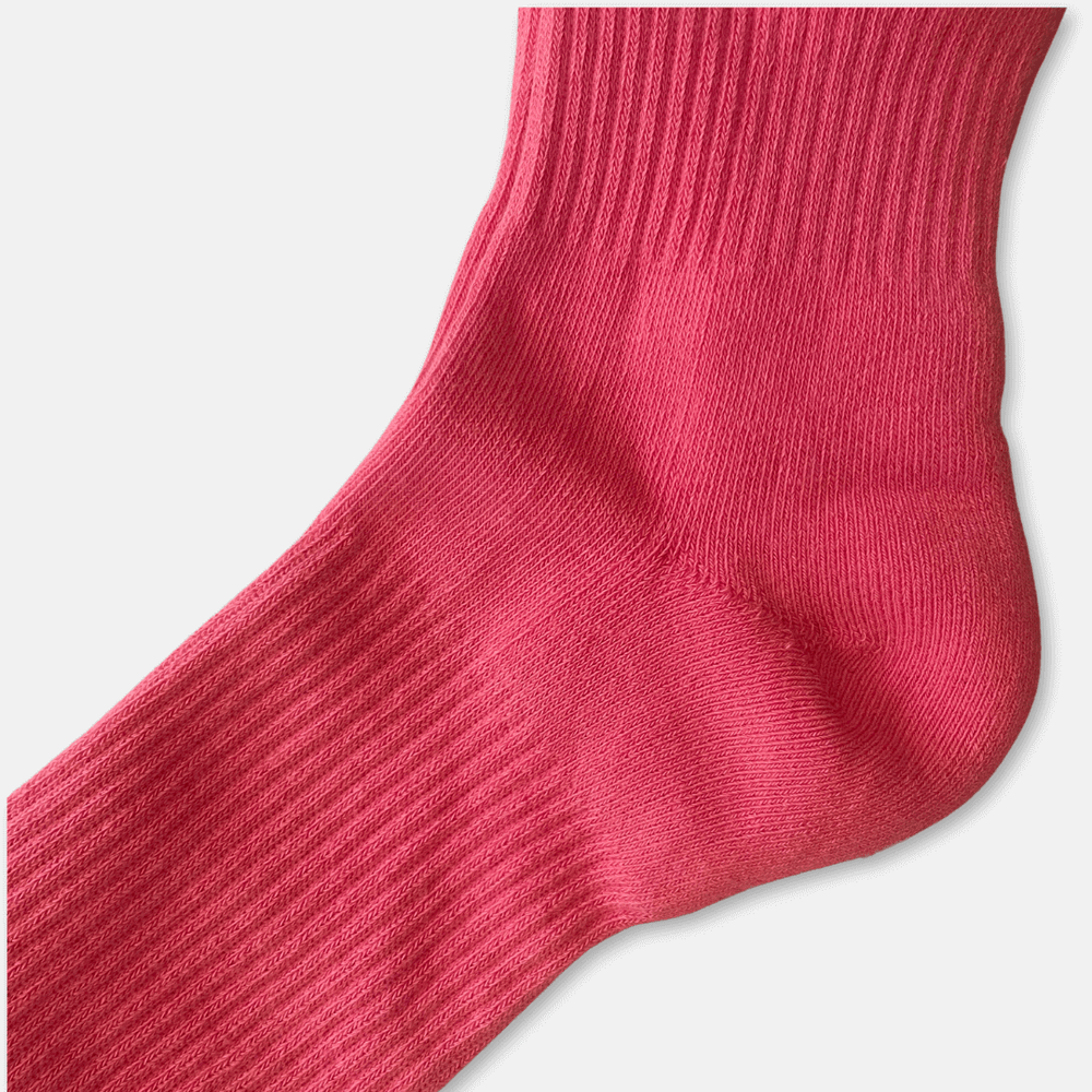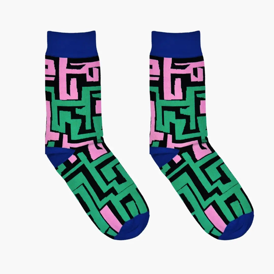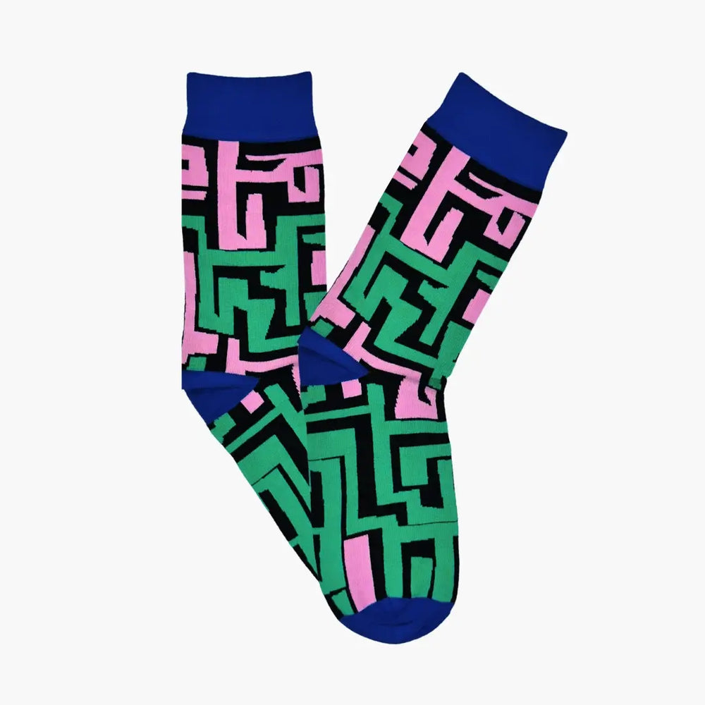 - Adult socks with a minimalist red, blue, black and mauve pattern