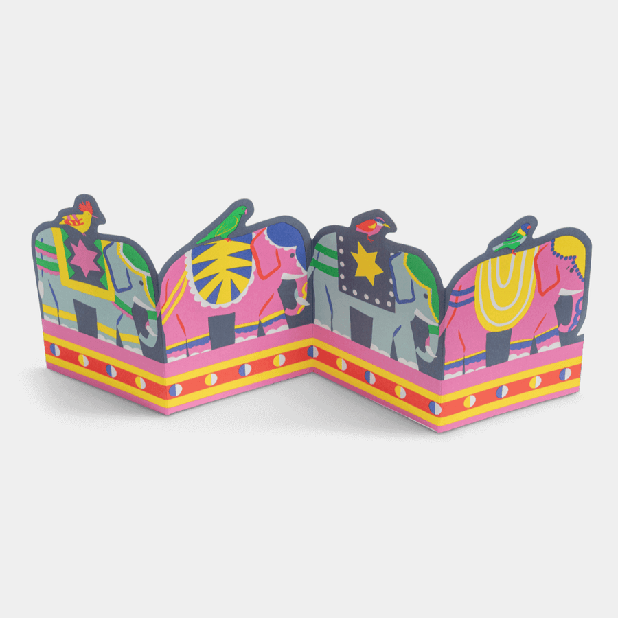Send this colourful procession of elephants and birds on a birthday, to celebrate a new baby or just to brighten someone's day. A gorgeous concertina card designed by Bristol illustrator Naomi Wilkinson, that looks wonderful displayed on a shelf or mantlepiece.