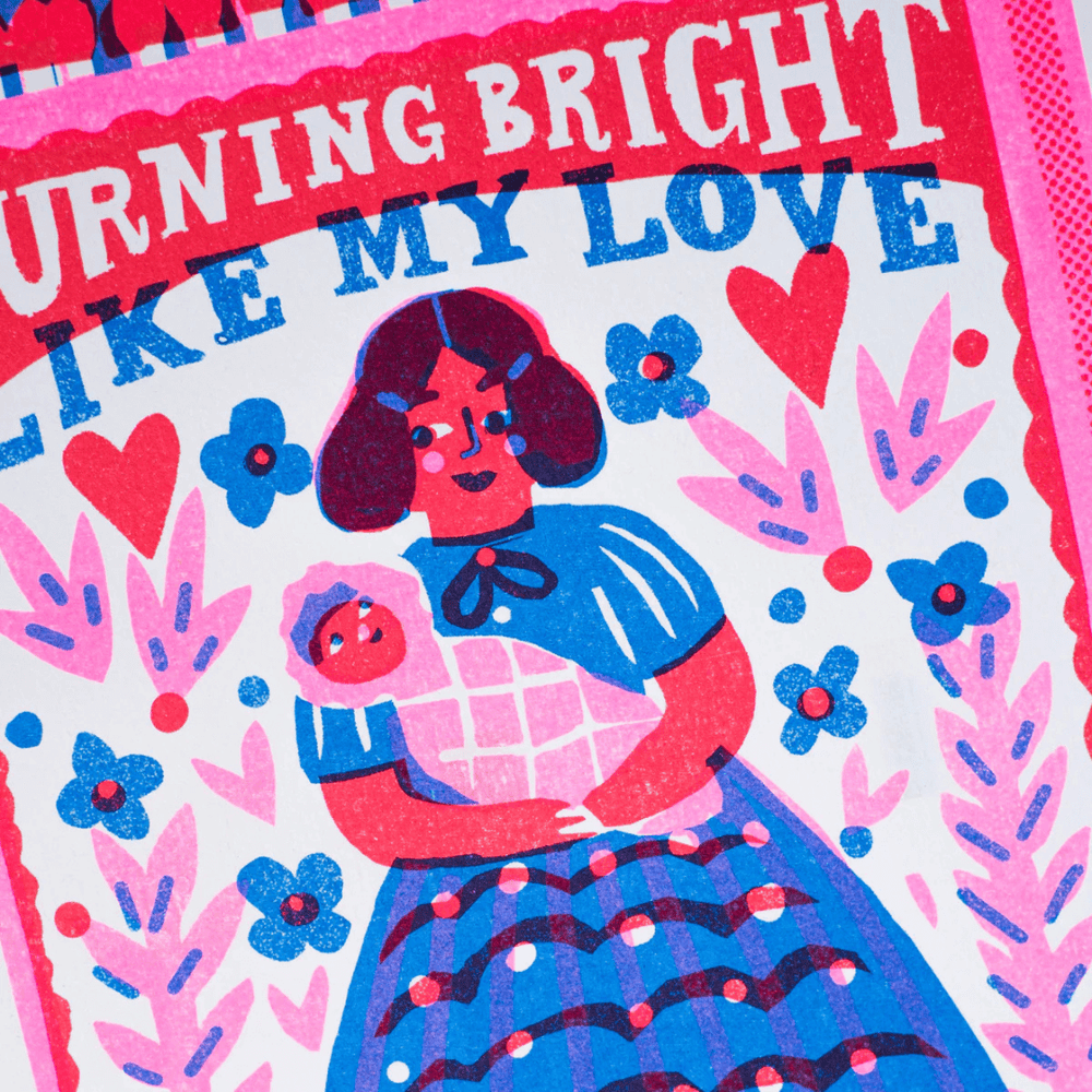 Spread a little love with this gorgeous Burning Bright Like My Love A4 Risograph Art Print by The Printed Peanut.