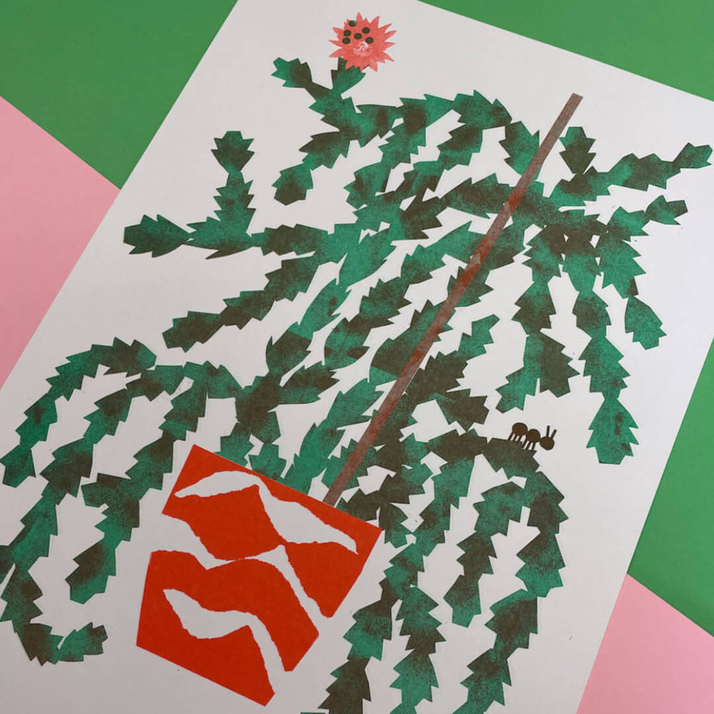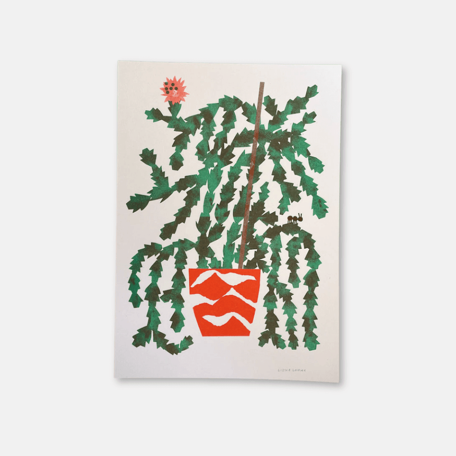 - 2 colour riso print of a flowering Christmas Cactus plant in a red pot