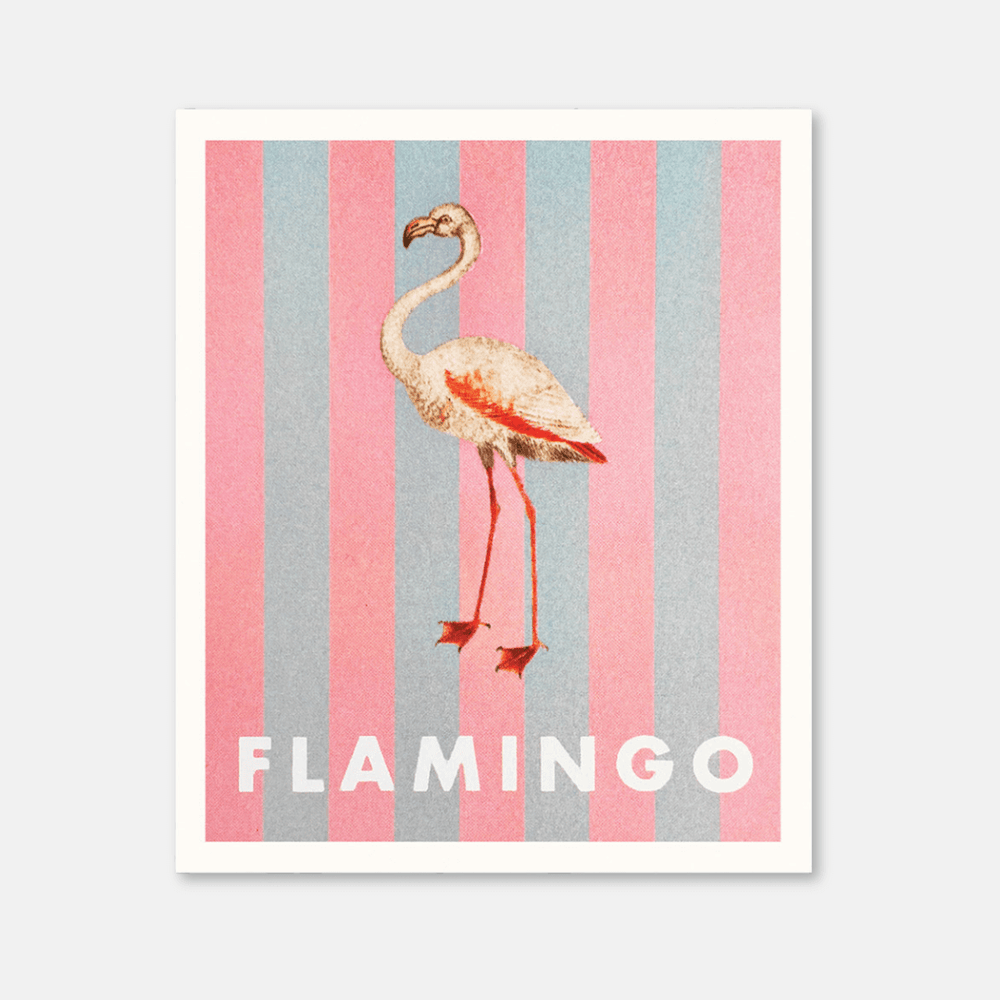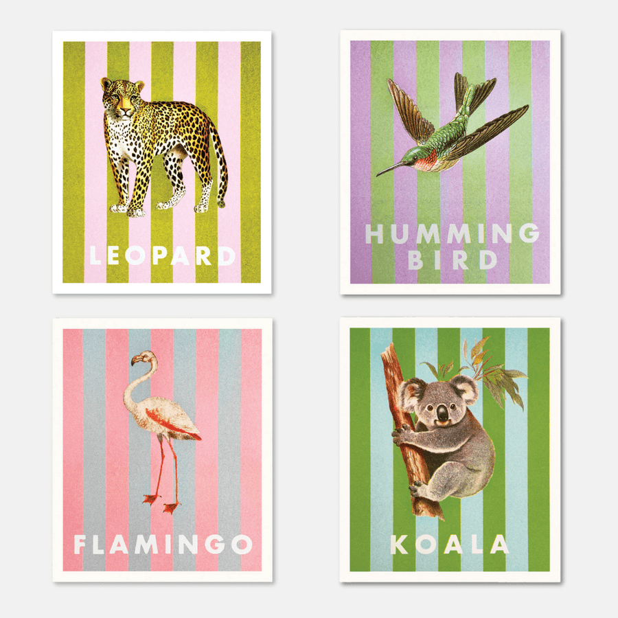 - A5 risograph prints featuring animal illustrations against a colourful striped background and bold typography