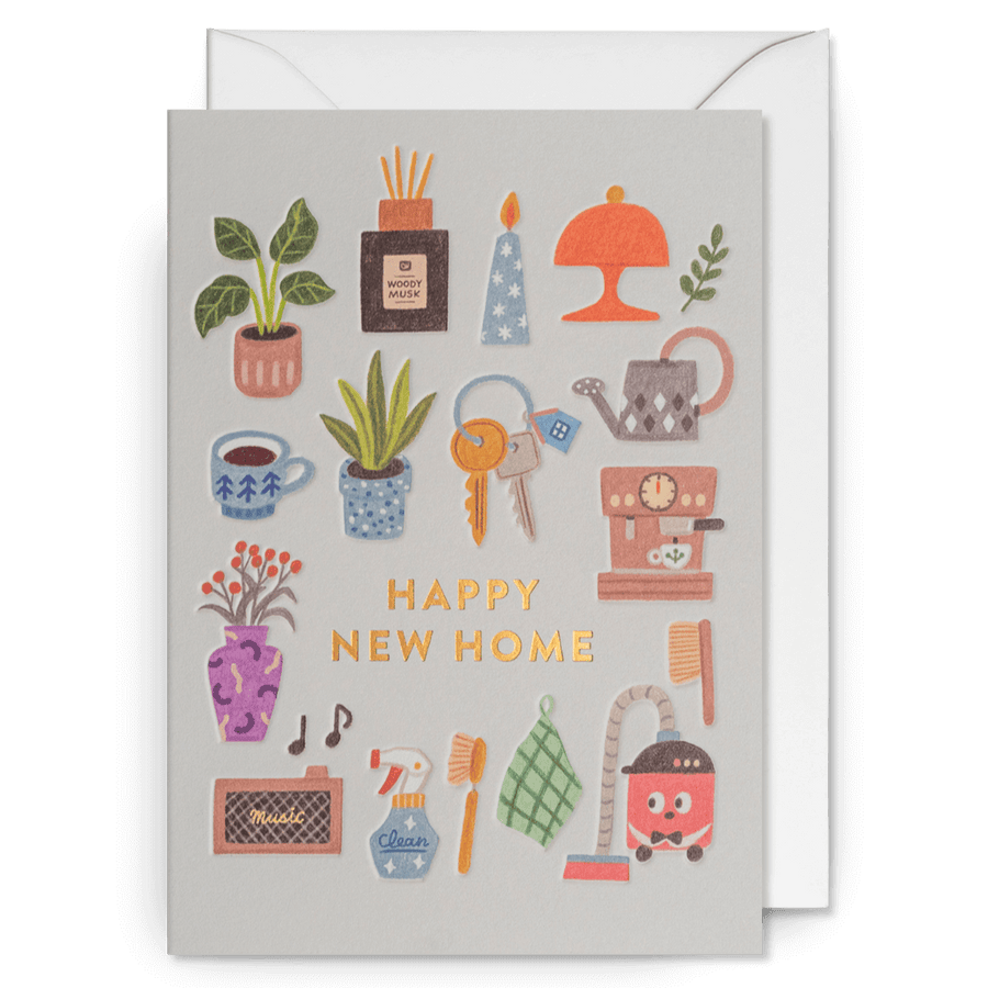 Wish friends and family happiness in their new home with this super cute greetings card from illustrator Annelies Draws. Featuring some of the things that make a home including house plants, a coffee maker, candles, a radio, lamps and a Henry hoover!