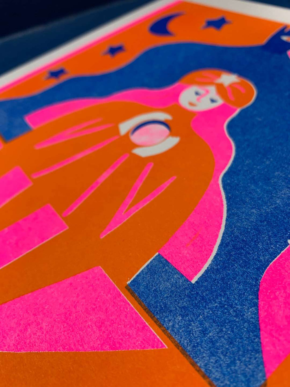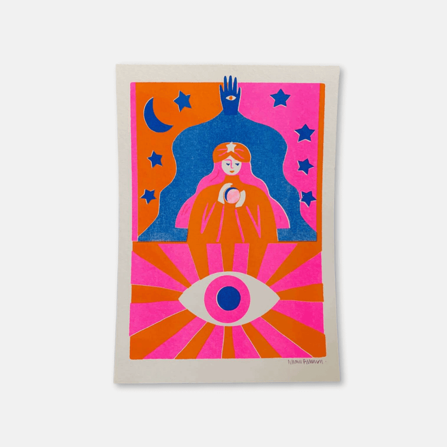 A riso print collaboration between local artist Naomi Wilkinson and BAM. This A4 mystical palm reader will bring some of that magical riso neon in to your home.