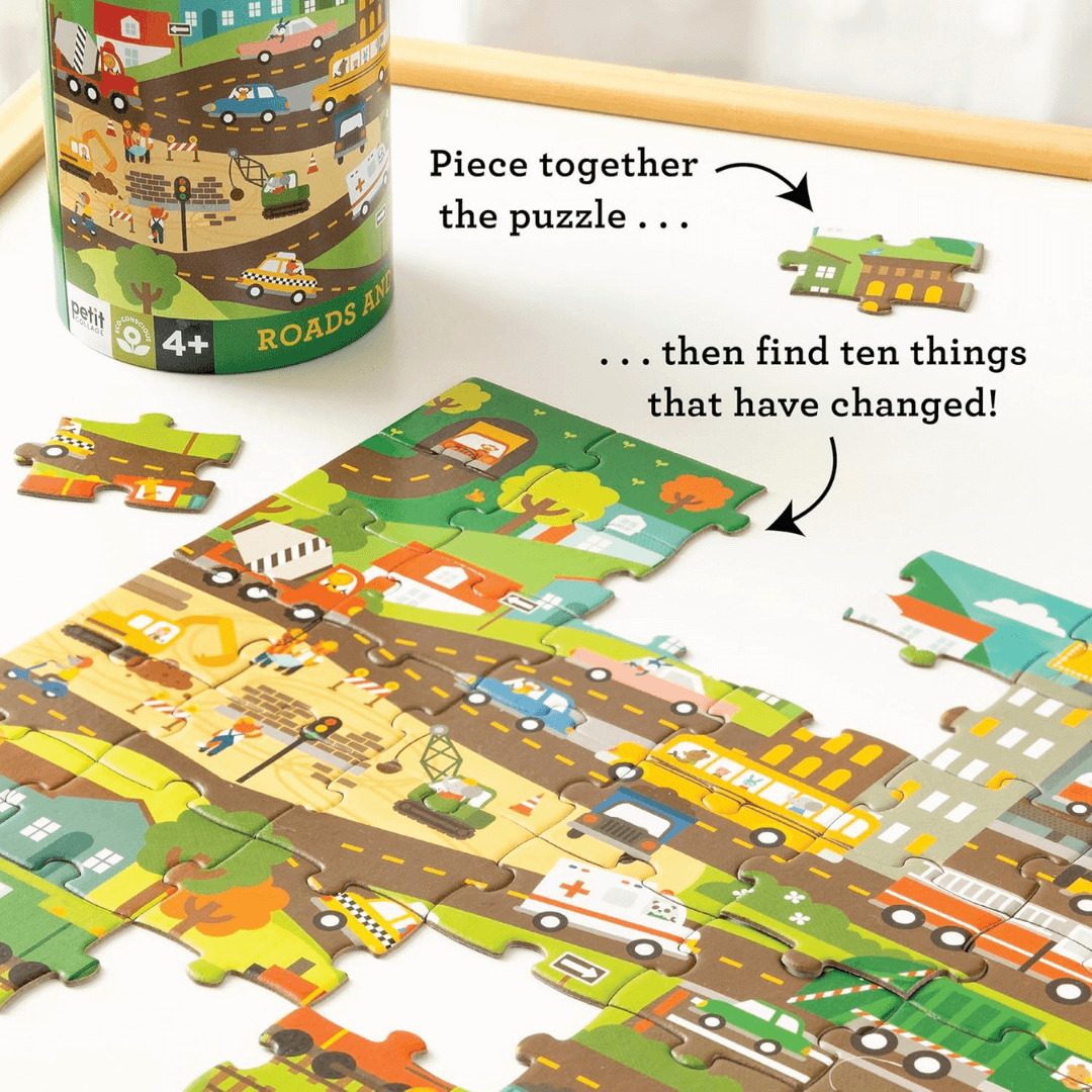 Enter a busy world with this wonderful Roads and Rails Spot-The-Difference Puzzle from Petit Collage. Small children will love piecing together the puzzle and then searching for the changes on the poster sheet.