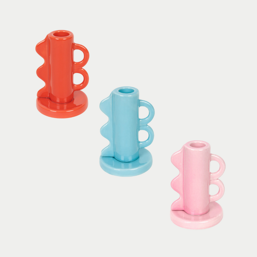 - Light blue, light pink or red ceramic candle holder with a distinctive curved design