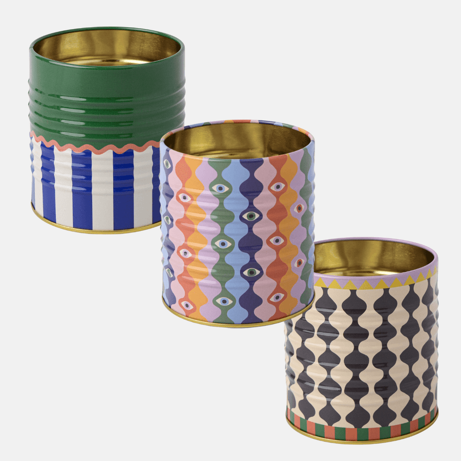 - Ridged metal storage tins with Mediterranean inspired designs