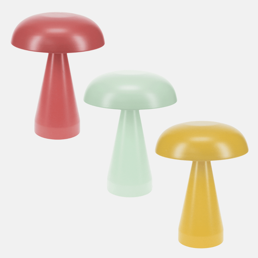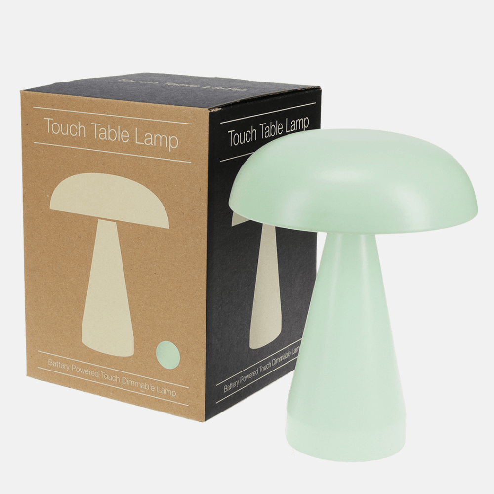 - Battery powered touch lamp with a stylish mushroom shaped design