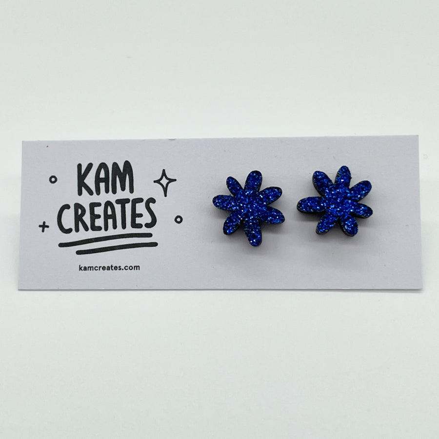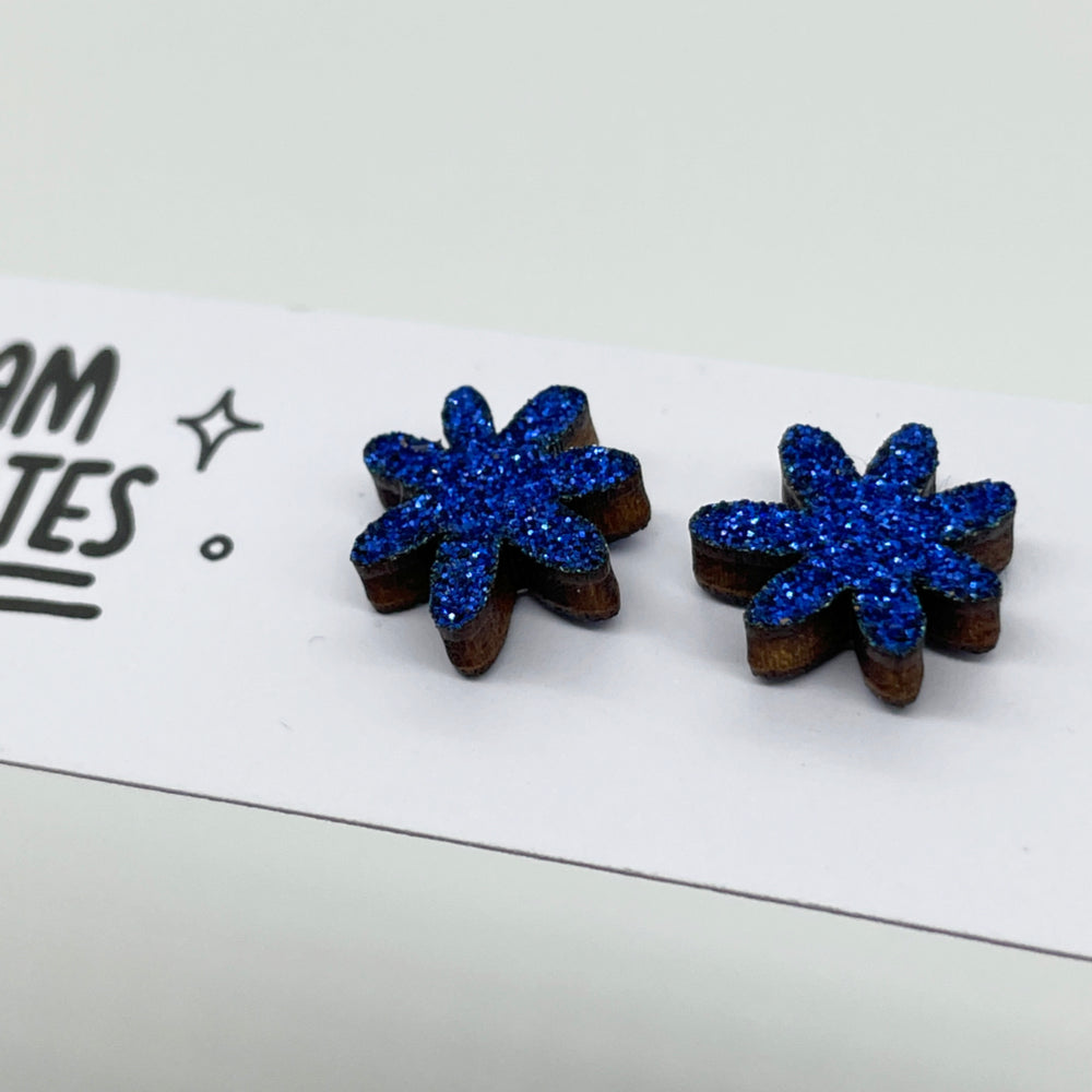 - Small flower shaped studs with an eye-catching sparkly blue surface