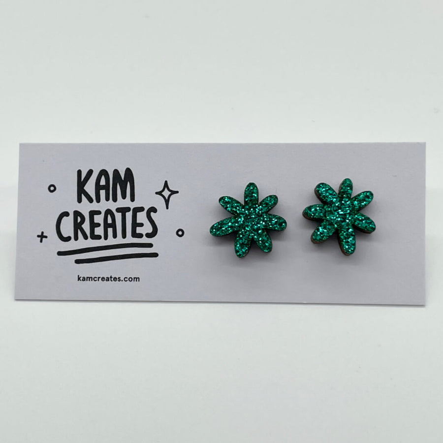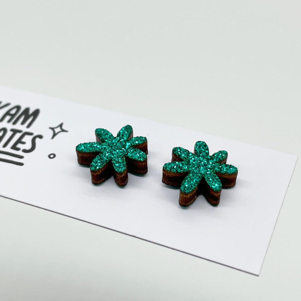 - Small flower shaped studs with an eye-catching sparkly emerald green surface