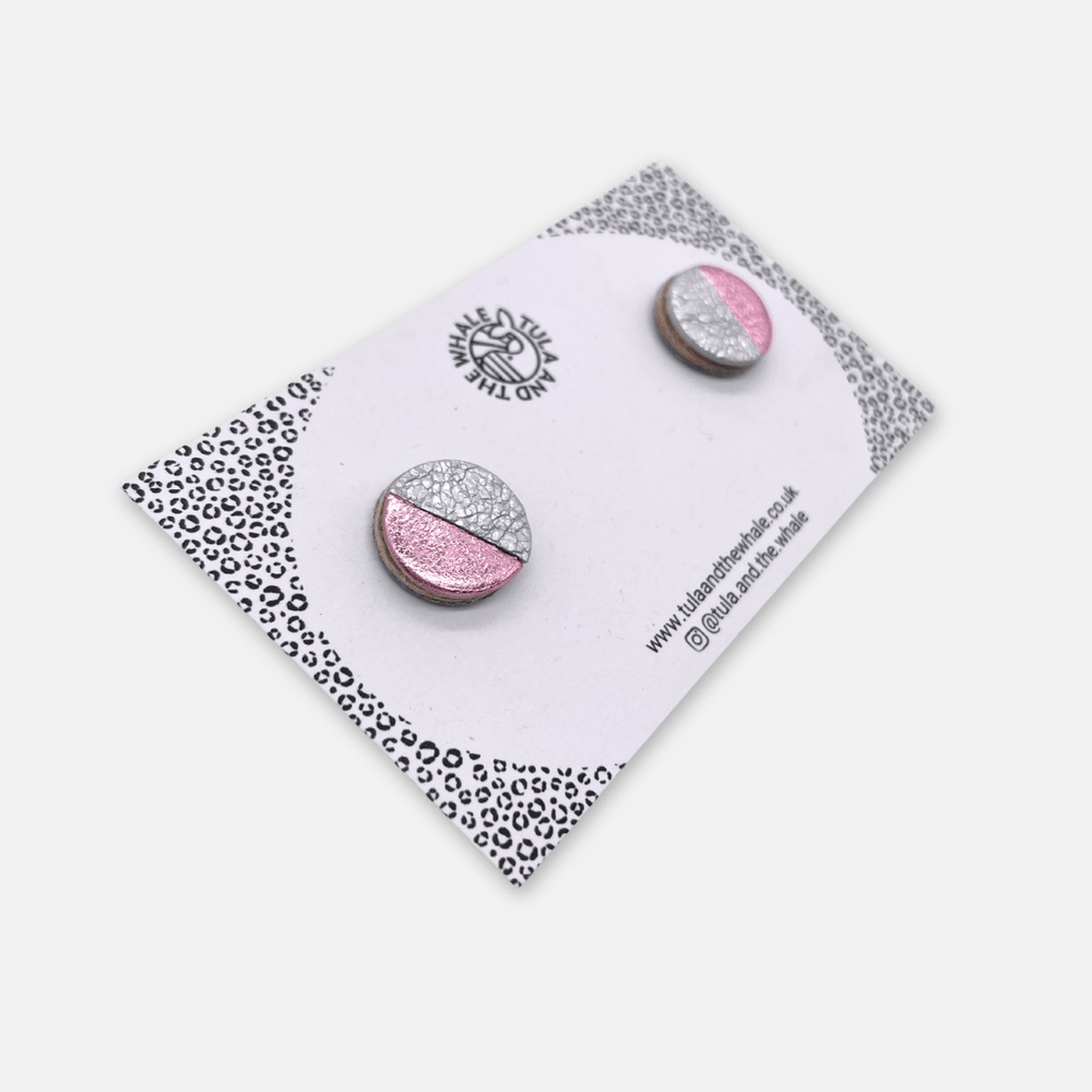 - Recycled leather mini stud earrings in a two-tone circle design