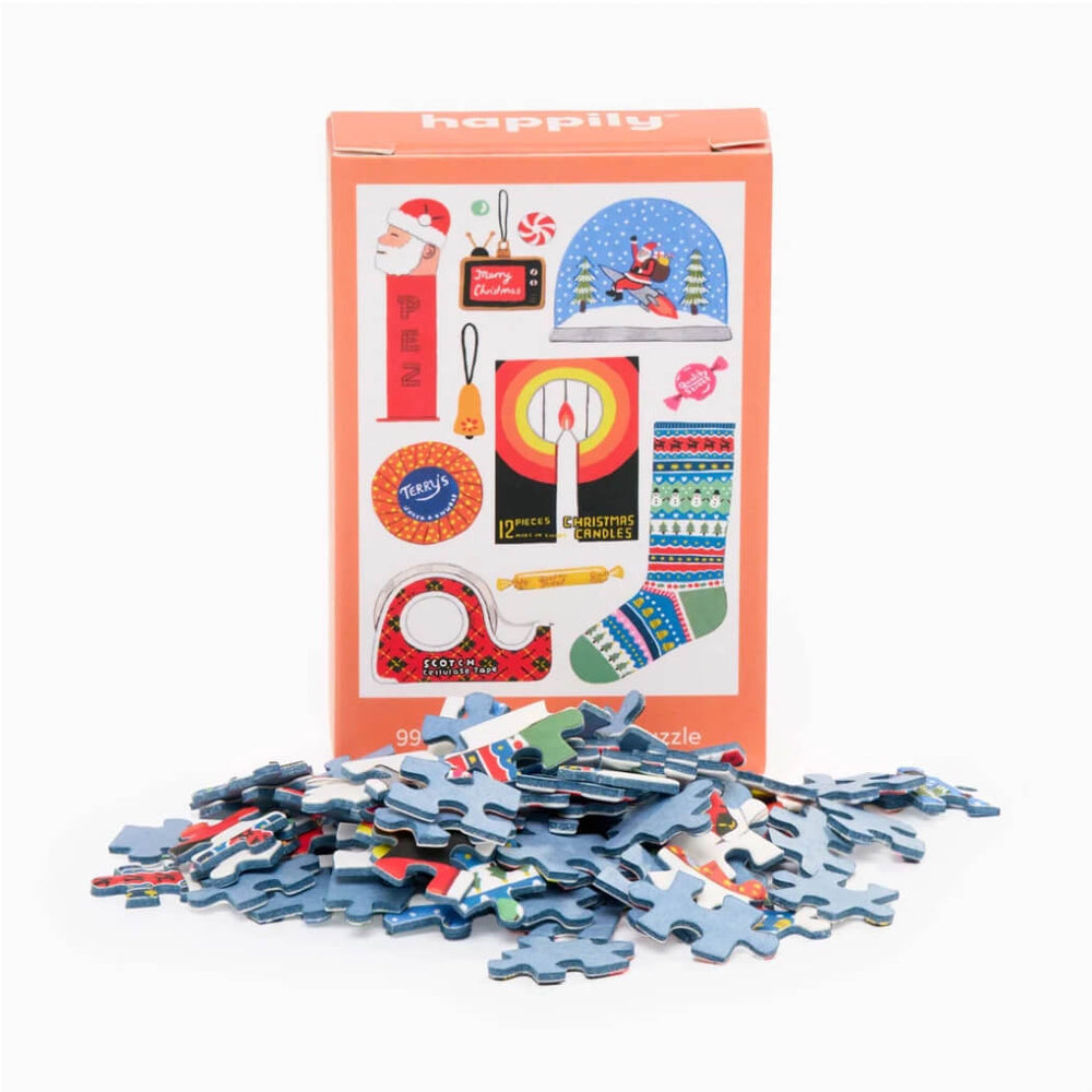 - 99 piece jigsaw puzzle featuring an illustration of Christmas items such as a snowglobe, Terry's chocolate orange, a stocking and more