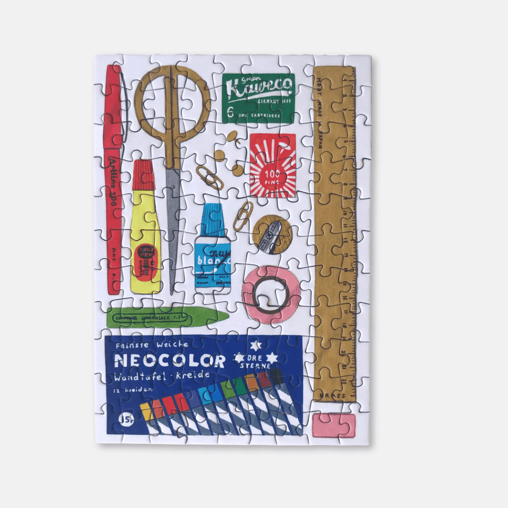 - 99 piece jigsaw puzzle featuring an illustration of classic stationery including scissors, pens, glue, ruler and more