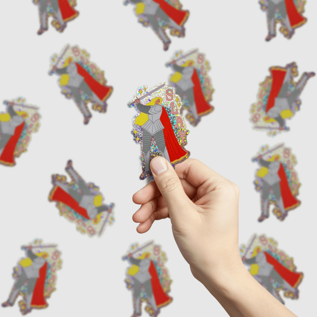 This SLAY Vinyl Sticker from Little Black Cat Illustrated Goods is ideal for personalising your laptop, notebooks, phone, helmet or water bottles. Featuring a fun illustration of a figure with flowing blonde hair in armour brandishing a sword, this glittery sticker is made from a high quality weatherproof, UV stable PVC gloss vinyl.