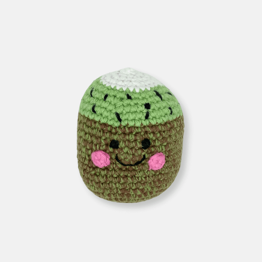 - Crocheted toy rattle in a friendly kiwi fruit design
