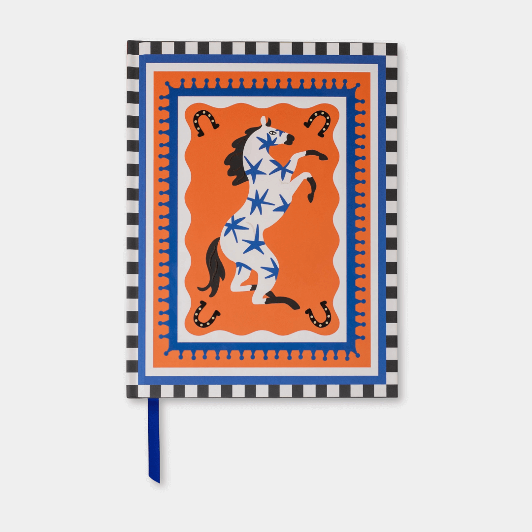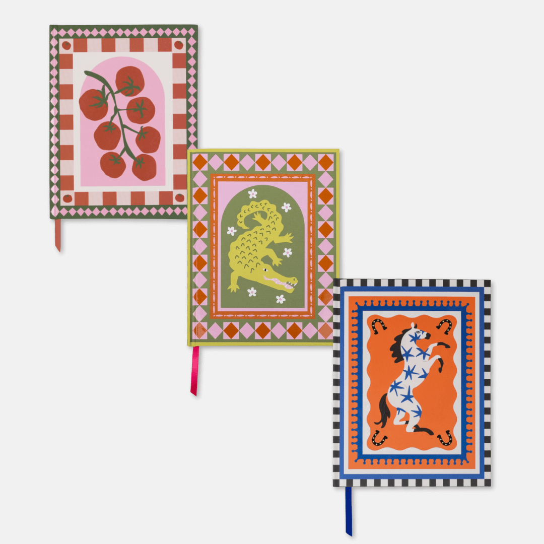 - Hardback notebooks with illustrative designs featuring tomatoes, a horse and moon phases