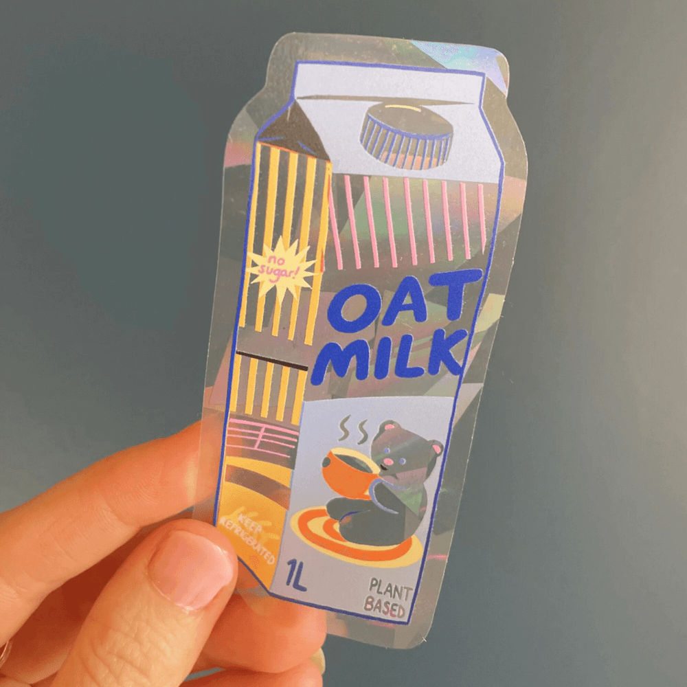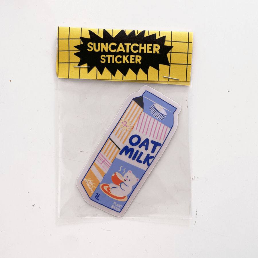- Suncatcher sticker featuring a carton on oat milk with a happy kitten packaging design