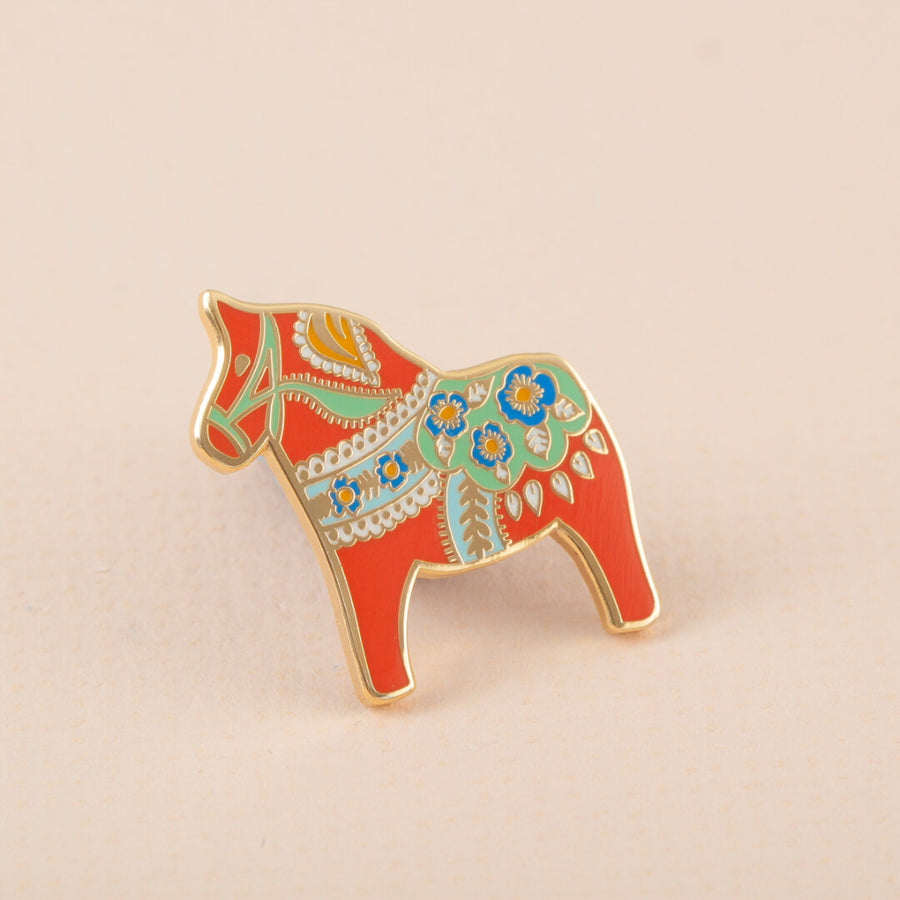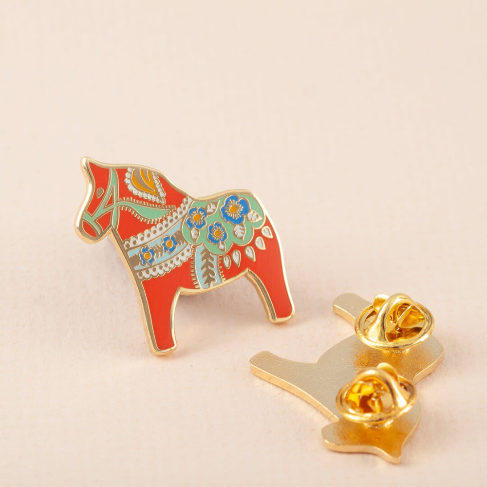 Inspired by the Swedish Dala Horse designs, this colourful enamel pin badge by Little Paisley Designs will add some colourful folk vibes to your outfit.